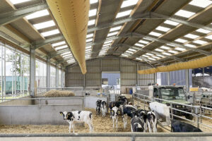 Kalvefjøset: Kalvane her sitt eige fjøs, fylt med halm frå eigen kornproduksjon i bingane. Med gardin i veggane og ventilasjon i taket. Foto: Privat