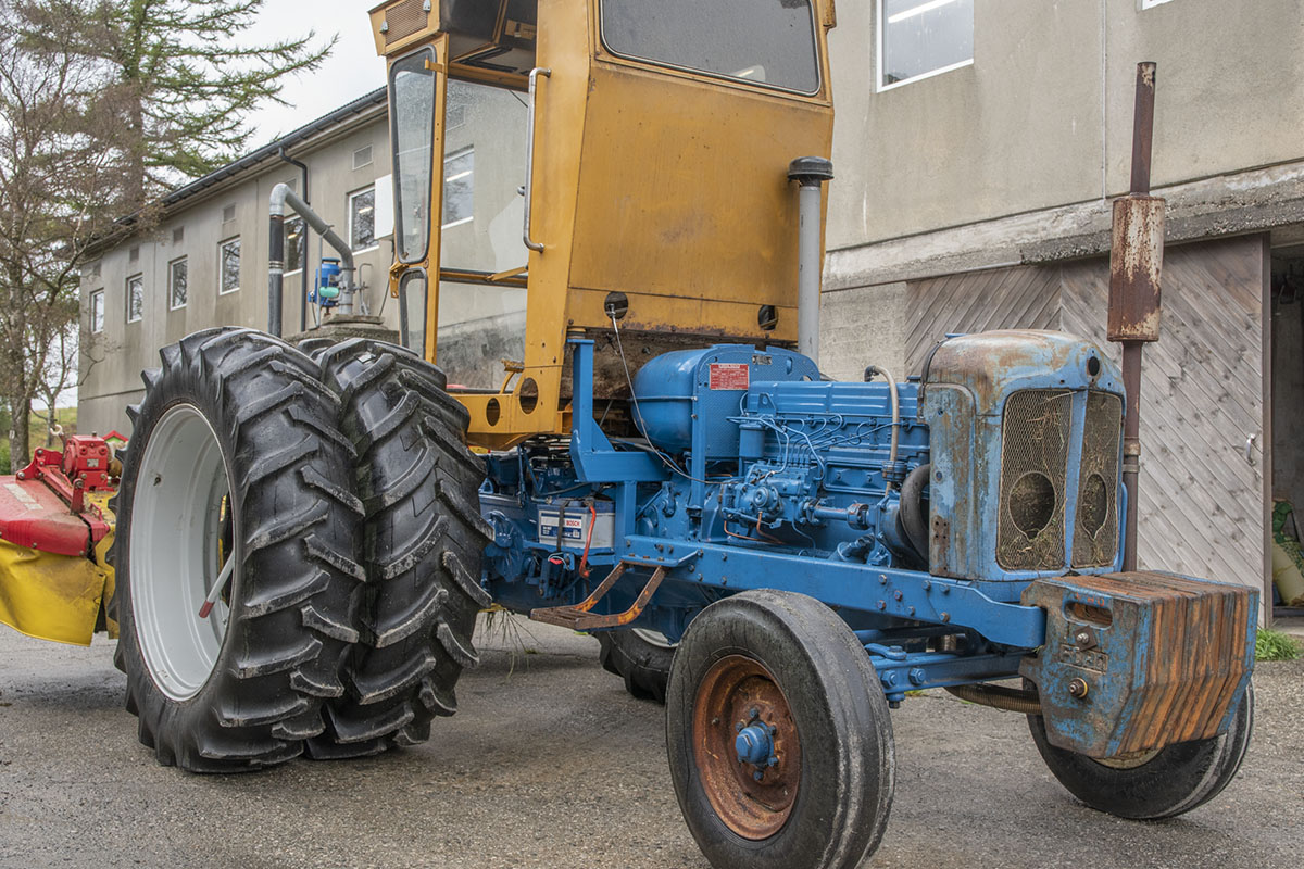 Flyt: Med tvillinghjul flyt doningen på snaue tre tonn over kjelvene. Den ombygde Super Majoren med ein tre meters slåmaskin på løftestengene slår fint 30 mål i timen med ein fart på kring 18 kilometer i timen. Førarkabinen er henta frå ein utrangert skurtreskar på Austlandet.
