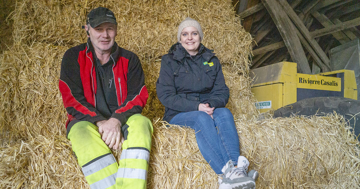 Fôrprat: Bonde Tor Torland og rådgivar Ingrid Ropeid frå FKRA diskuterer fôringsstrategiar. Her har dei på oppfordring frå Bondevennen funne sete i eit parti rughalm i løa til Tor.