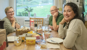 Fellesskap rundt bordet: Sisilia inviterer til god lunsj med heimebaka rundstykke. F.v. Randi, Lene og Sisilia.