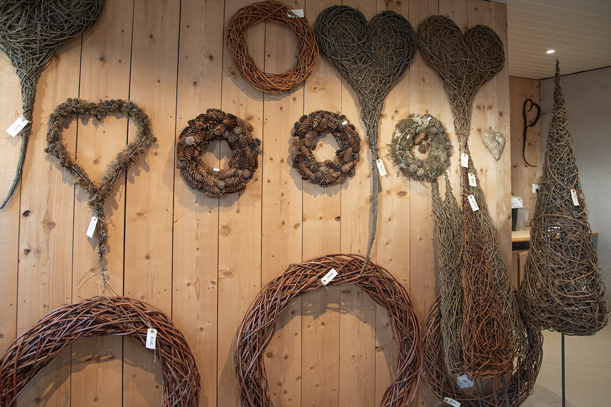 Pynt av pil: Greiner og kvistar frå piletreet er veleigna materiale til vakre dekorasjonar. På juletregarden er utvalet stort. Biletet til høgre syner buntar med pilegreiner.