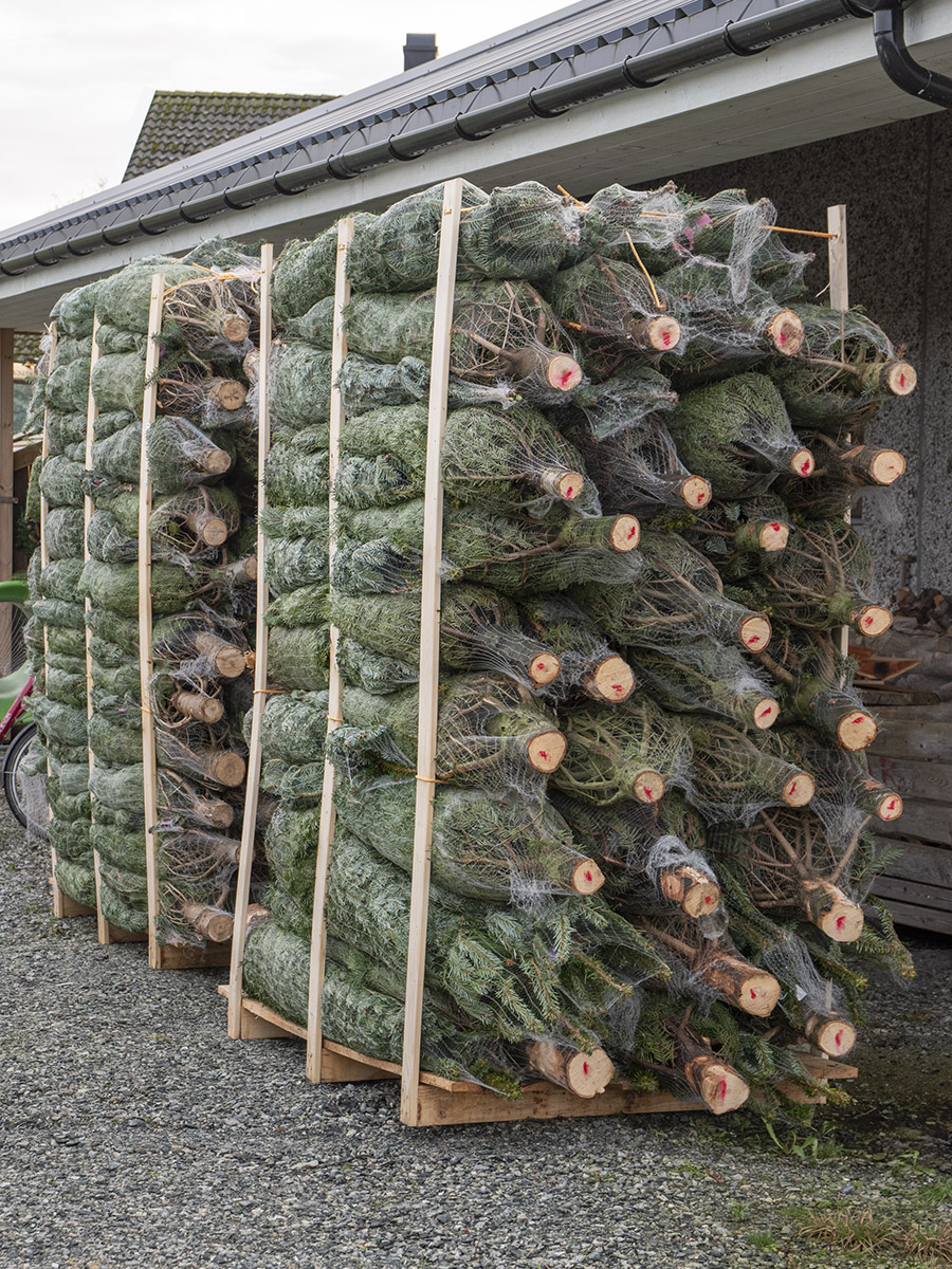 Grøne og snart glitrande: Voll Juletregard produserer eigne tre til sjølvhogst. På desse to pallane ligg innkjøpt fjelledelgran som skal vidareseljast til gardens kundar.