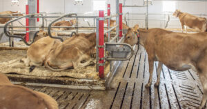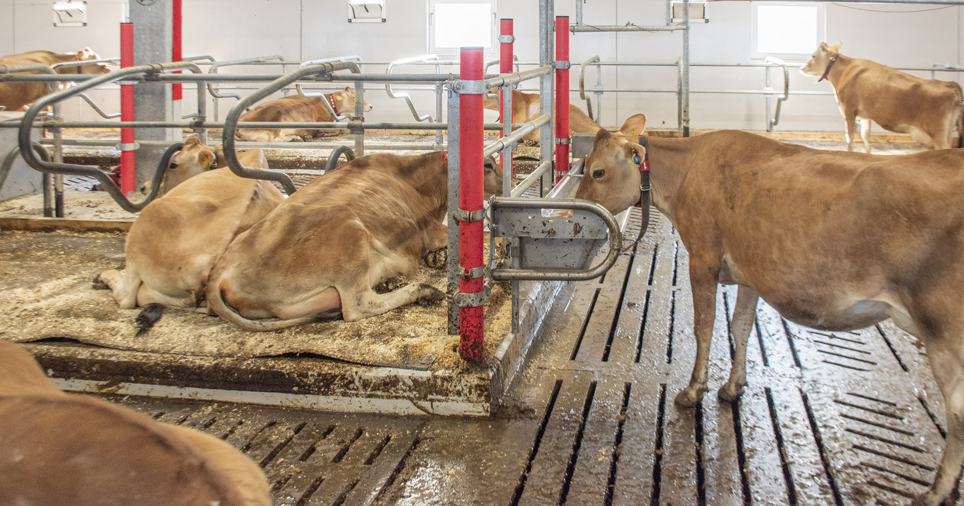 Kukomfort: Fjøset vart utvida i den eine enden for å få plass til tre liggebåsrekker og god plass rundt mjølkeroboten. Alle kubåsane har vassmadrass
