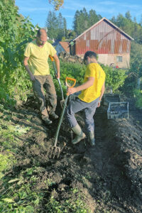 Familieprosjekt: Dei tre barna til Stefanie og Kristoffer hjelper alle til i åkeren. Favoritten til Lukas (t.h.) er å «greibe» og jobbe med jorda. Foto: Stefanie Urdal