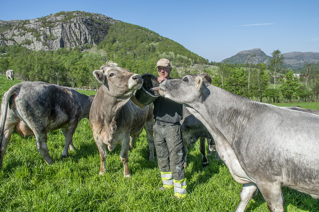– Eg drar nytte av dyras kjennskap til kraftfôret når eg skal samle flokken, seier bonden.