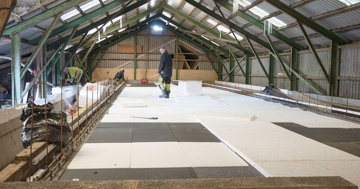 Føden: Det er hektisk byggeaktivitet på garden. Her er det fødeavdelinga på låven som begynner å ta form. Til saman får bruket 700 kvadratmeter produksjonsareal når ombygginga og renoveringa er ferdig.