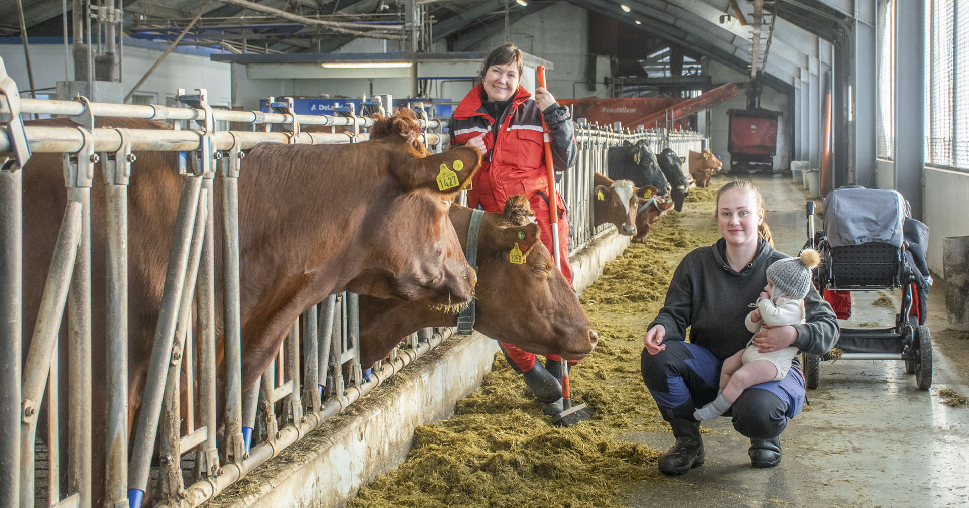 Tre generasjonar: Amalie er tilsett i fjøset hjå svigermor Elin. Om få år byter dei roller.