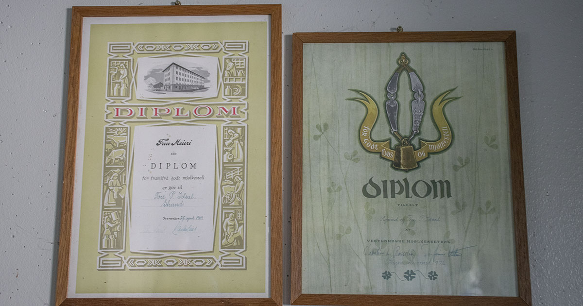 I 27 år på rad har Idsal-bonden levert elitemjølk til Tine. På hylla står Sølvtina som eit bevis for femten år, og Mjølkespannet som ein takk for 25 år med elitemjølk. På bordet ligg Avlsdiplom frå Geno for oksen 12037 Eiane som vart eliteokse i 2019. Nyleg kjøpte Geno inn enda ein oksekalv frå Idsal for vidare testing.