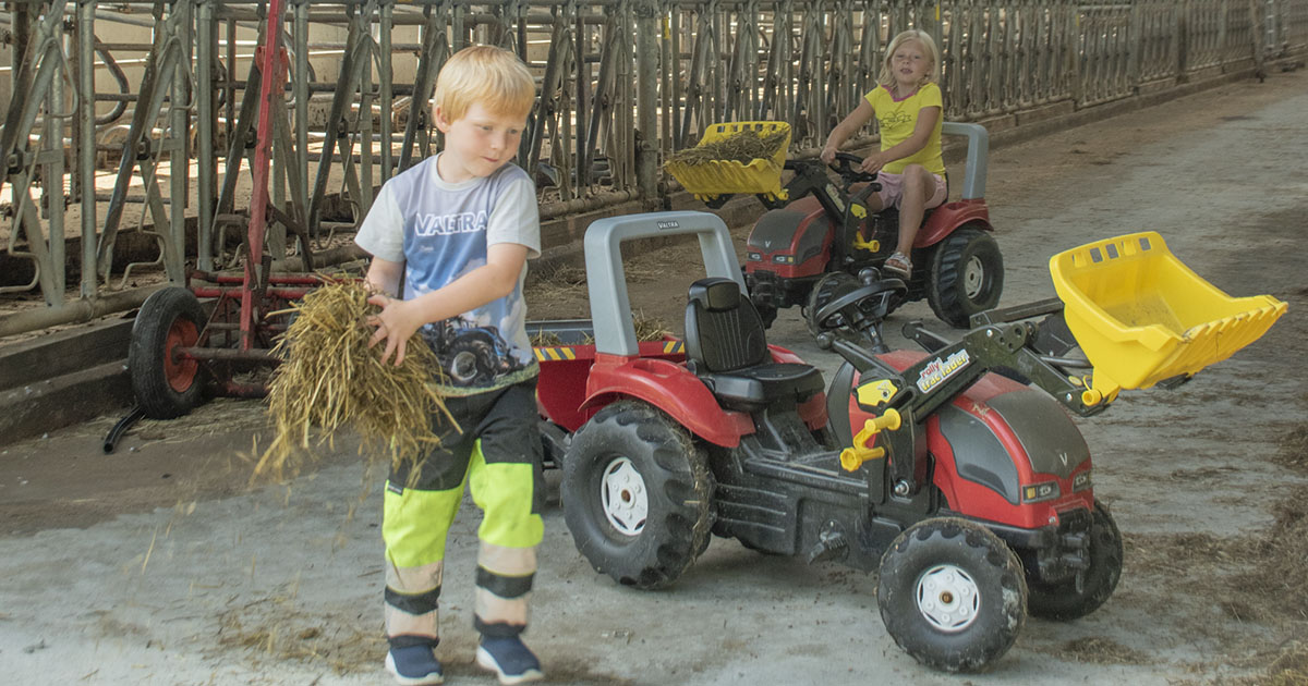 Bøndene er samde om at det er ei viktig prioritering. Ungane på garden, Martha og Sivert, er også med i fjøset. Fôrbrettet er ein fin trasé for trøtraktoren.