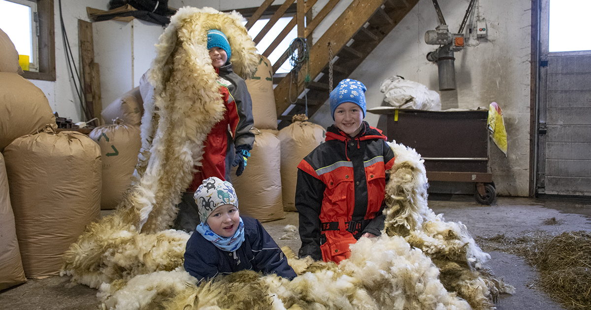 Varmt og mjukt: Henrik (7,5), Johan (3,5) og Mathilde (9,5) får boltre seg i nyklipt ull. No gler dei seg til lamminga. Men eigentleg likar Johan best grisungane på garden. For Henrik er hunden Scotty kjekkast, medan Mathilde trivst best med lamma.