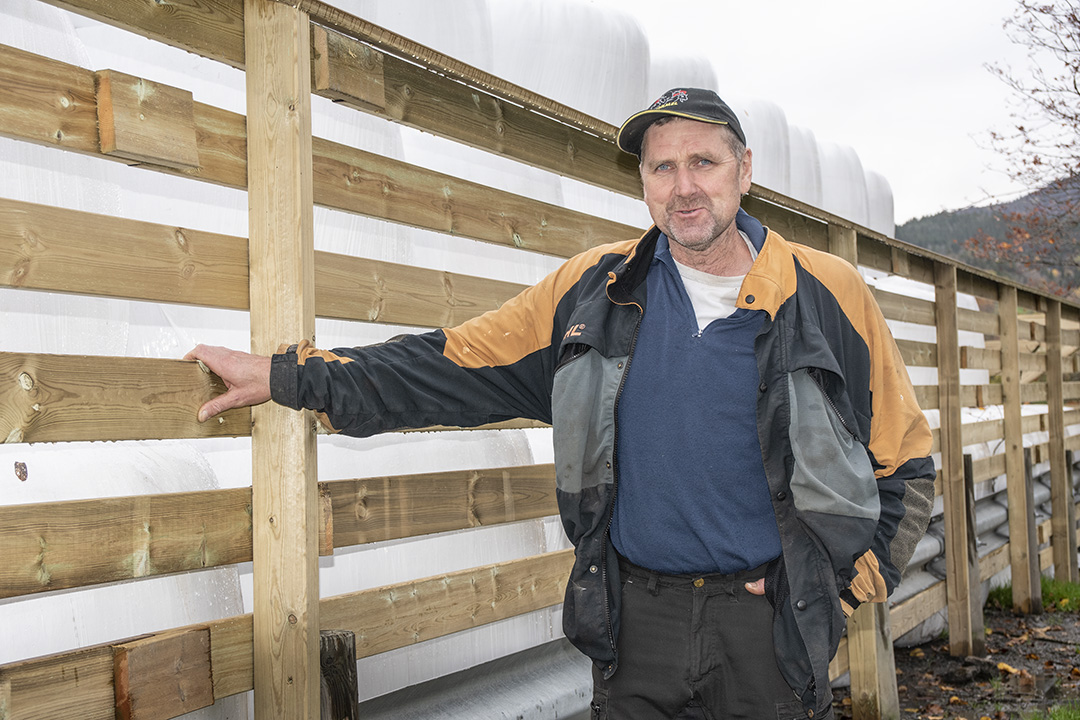 Hjorteplage: Hit, men ikkje lenger. Det må eit solid gjerde til for å halda hjorten unna vinterfôret til Bjørne Røthe. Fundamentet er vegfenderar som er festa i bakken med kraftige stolpar.