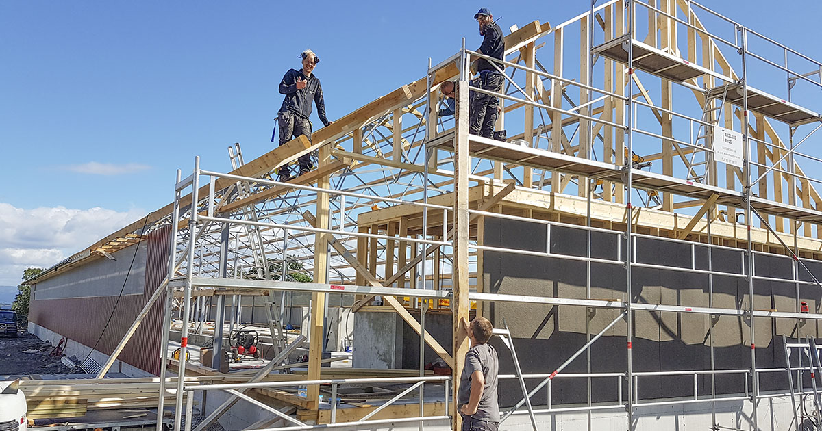 Byggesjau: Fjøset på 55,5 X 14 meter under bygging. Stein Gunnar har hatt gode hjelparar med på laget under heile byggeprosessen. Eigeninnsatsen til fjøset er rekna til 700.000 kroner. Foto: Stein Gunnar Nordeide.