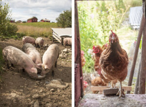 Setergris: Lars har med seg både gris og høner til fjells. Og grisen nyt godt av matrestar, bringebær frå Moe Gard, og mjølkerestar frå fjøset. – Dei er heilt tulne etter surmjølk, seier Lars.