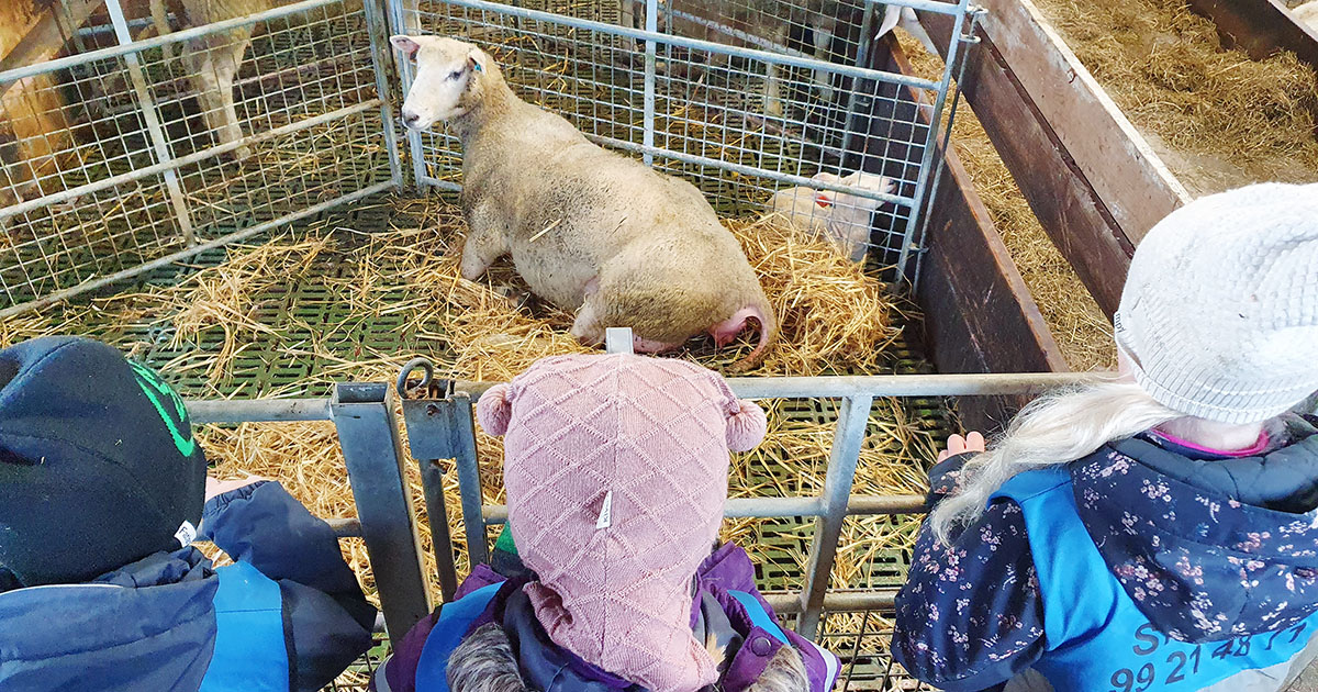 Barnehagen danna eit levande gjerde då saueflokken med lam skulle ut første gong.