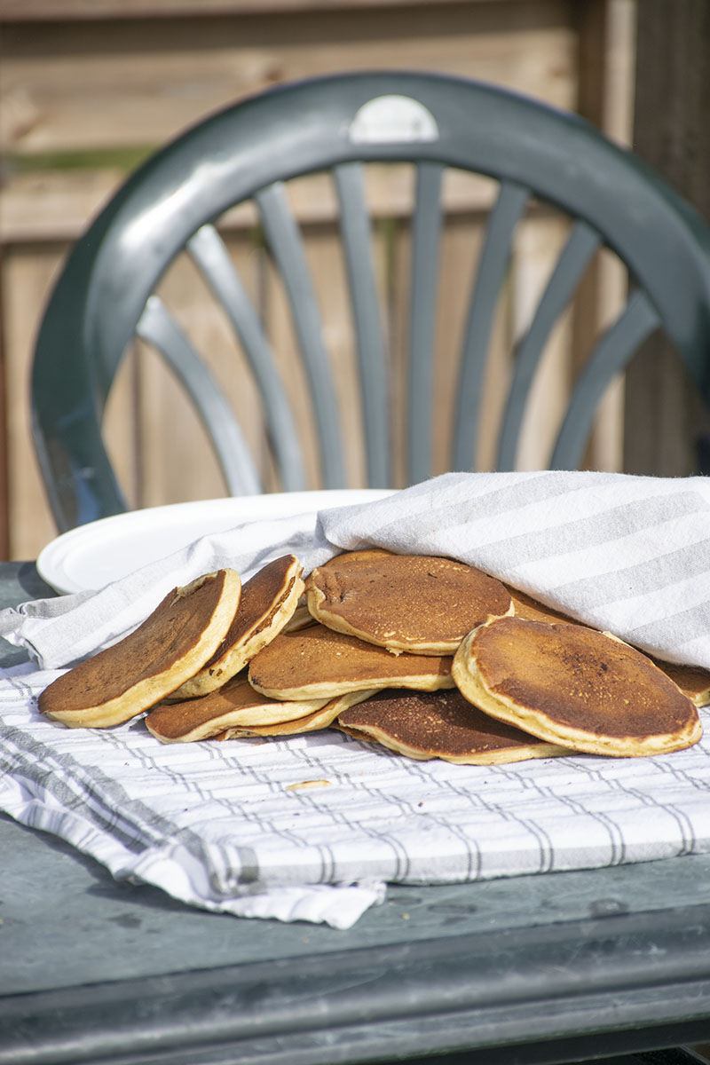 På terrassen er det saft og lappar å få, og tid til spørsmål. F.v. Tonje, Katrine, Mathilde (bak) og Siri.