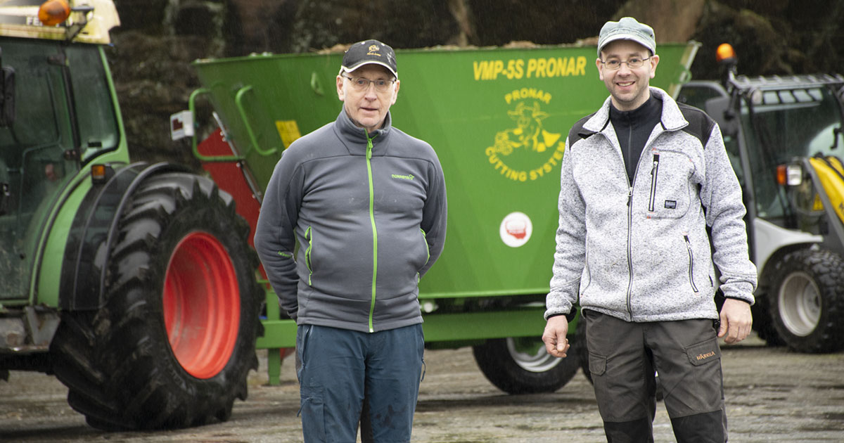 Bonde og kårkall: Erik har jobb utanfor bruket og faren Leif har status som kårkall og tidlegare pensjonist. - Kårkallen er ei fin oppfinning, også for små bruk, seier Erik.