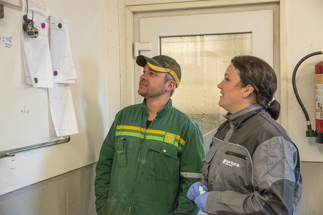 Logg: Torkel Svela arbeider målretta for å betra resultata i slaktegrisproduksjonen. Han lyttar gjerne til råd frå kollegar og rådgivingstenestene. Her synar han rutinane for loggføring på oppslagstavla til rådgjevar Hilde Elin Østerhus frå Nortura. – Eg vil ha det slik at folk skal kunna koma og sjå i grisehuset mitt til ei kvar tid, seier han.