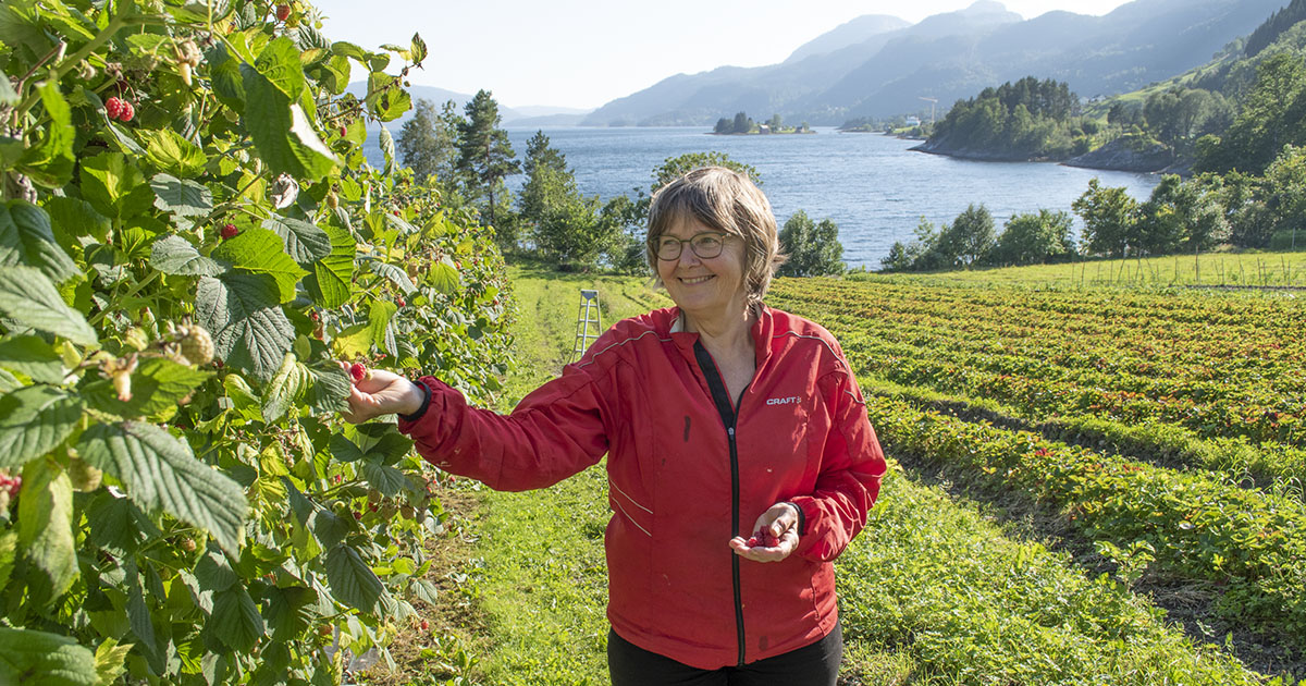 God avling: Anne Lise har fleire ulike vekstar på garden. Bringebæravlinga var god i år. – Eg ser eg må plukke litt i kveld, seier ho.