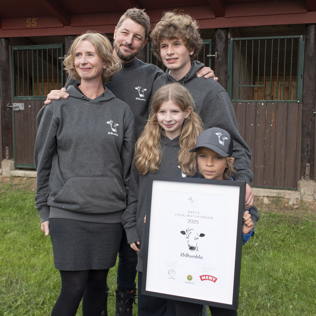 Årets lokalmatgründer: Under Dyrsku’n i Seljord vart Ødhumbla kåra til Årets lokalmatgründer. – Ei fin stadfesting av at små driftseiningar og lokal foredling har ein verdi – både økonomisk, kulturelt og samfunnsmessig, seier Jørn. Her i lag med Berit, Amund og Ragna, og syskenbarnet Isak.