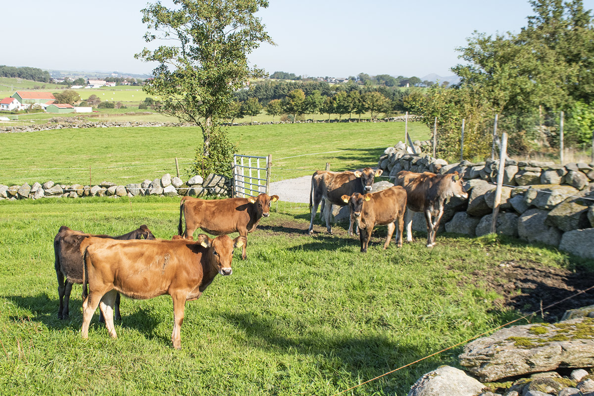 Jersey og vestlandsraudkoller: Dei overtok ein flokk med vestlandsk raudkolle, men la om til jersey. No er raudkollene på veg tilbake i buskapen.