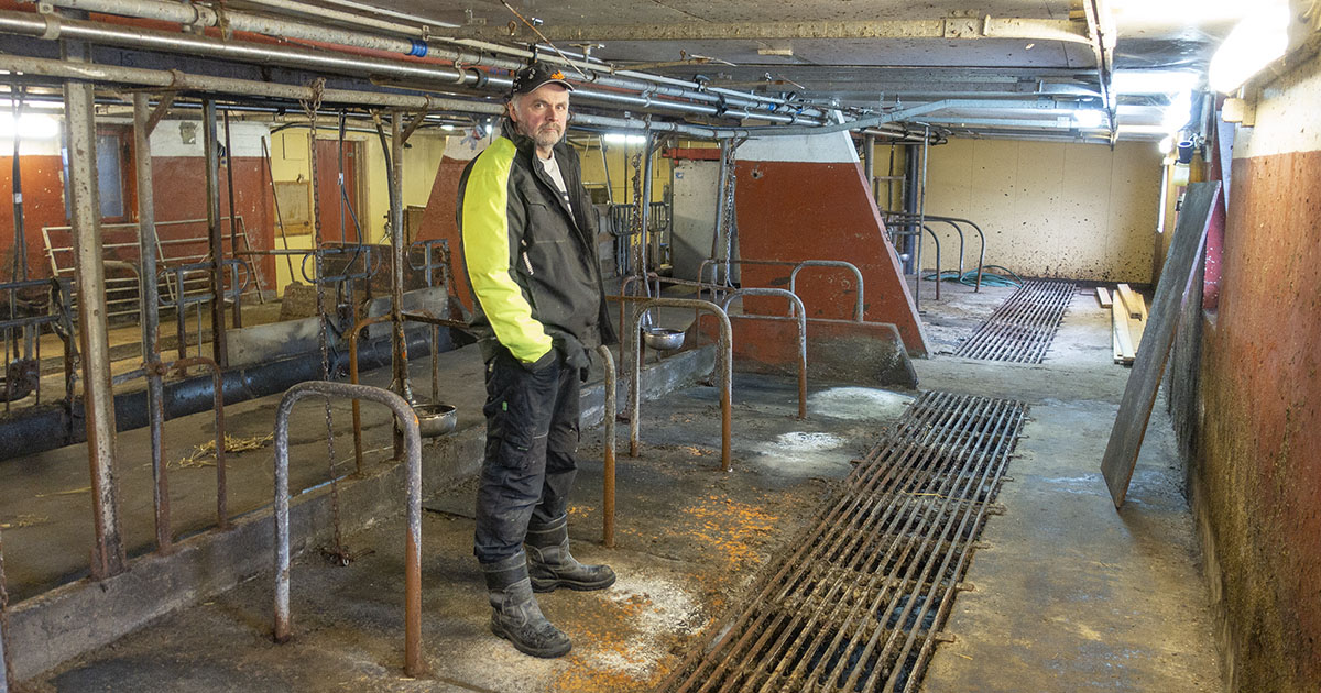 Eilef Netland (56) tar i dørhåndtaket, og lukker døra bak seg. Vi står i floren med de tomme båsene, hvor han inntil for ett år siden hadde femten melkekyr og like mange ungdyr.