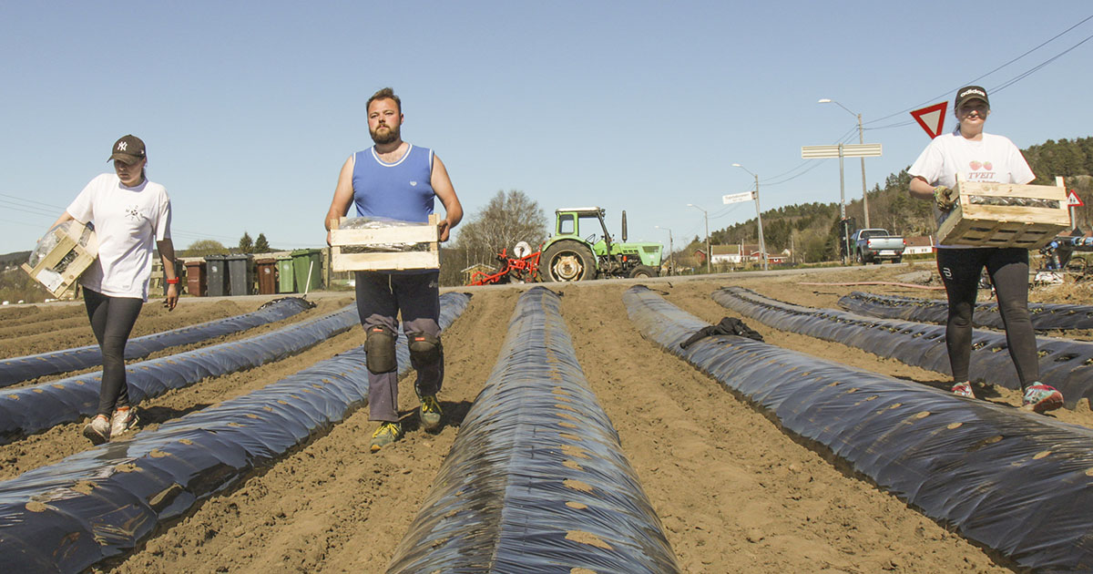 Ti polske sesongarbeidere kom nyleg til Kristiansand for å plante 150.000 jordbærplanter på gården til Karl Yngve Kristensen. – Nå tror jeg dette skal gå bra likevel, tross korona, sier bonden.