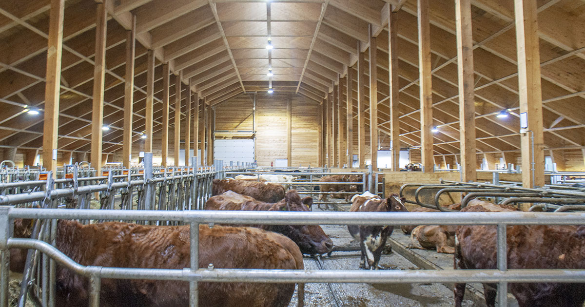 Fjøset er bygd i tre, og måler heile 1800 kvadratmeter i grunnflate. Med naturleg ventilasjon og heile 11 meter under møne er det friskt og luftig innandørs.