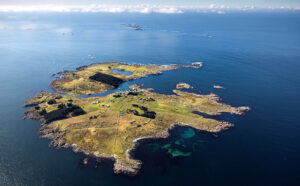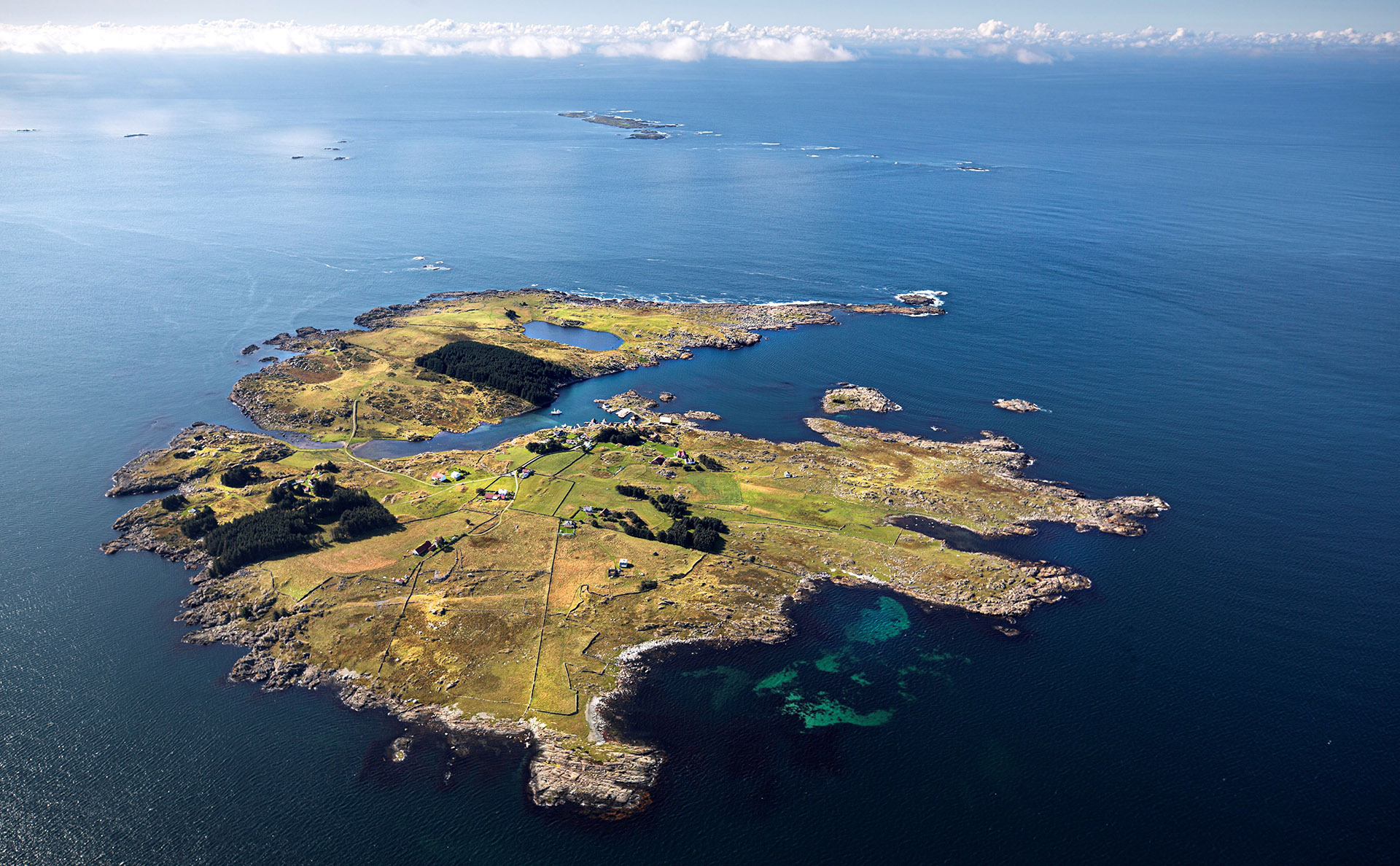 Rott i fugleperspektiv: På det meste var det ni gardbruk i drift på Rott. No er det berre Brynjulf og Eldbjørg som har dyr på denne historiske øya. Foto: Elisabeth Tønnesen.