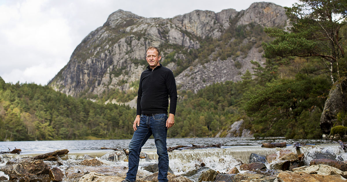 Bygger eget minikraftverk: – Folk må se at de kan skape noe mer på gården, og da må vi se på de ressursene vi har her, sier Torleiv Gåsland i Bjerkreim, som står på steinene like nedenfor dammen på Fossvatn.