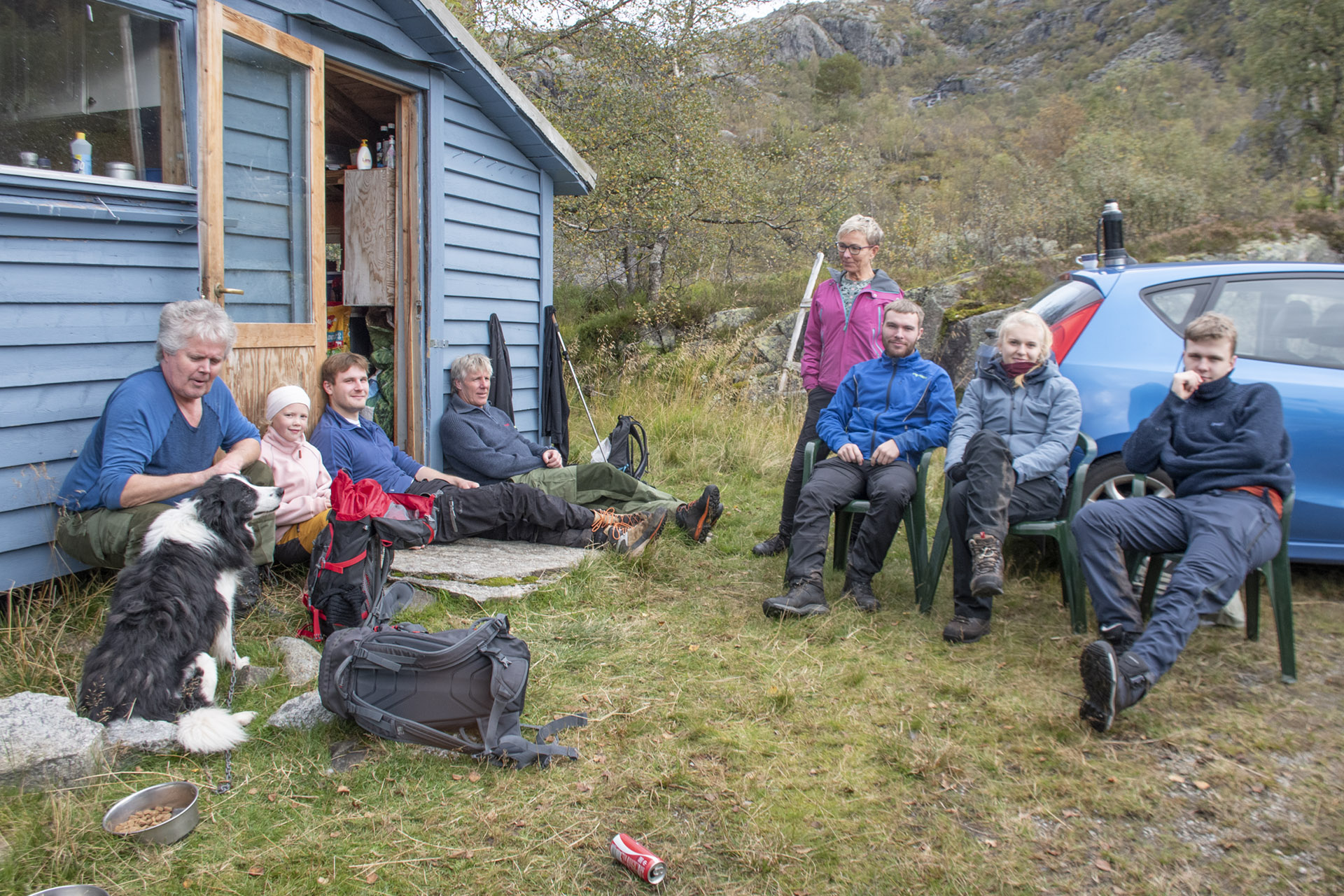 Hellig helg: Sanking er ikkje berre lange dagar i fjellet, det er òg eit viktig møtepunkt og fellesskap på tvers av generasjonar. Hellig helg, kalla dei det, gjengen utanfor hytta. F.v. Hunden Tico, Askild Eggebø, Malene Eggebø (9), Gisle Jordebrekk Fermann, Svein Jordebrekk, Anita Juvet Jordebrekk, Helge Jordebrekk, Hanna Hove og Mikal Vagle Jordebrekk.