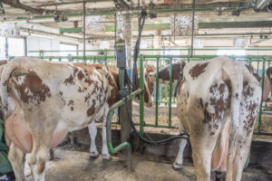Mjølketid: Skinneoppheng til mjølkemaskinane fungerer framleis bra på Hegelstad. Bøndene har investert i nytt sauehus. Båsfjøset fungerer fint i enda mange år. Men ny velferdsavdeling skal byggast med det første.