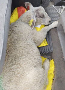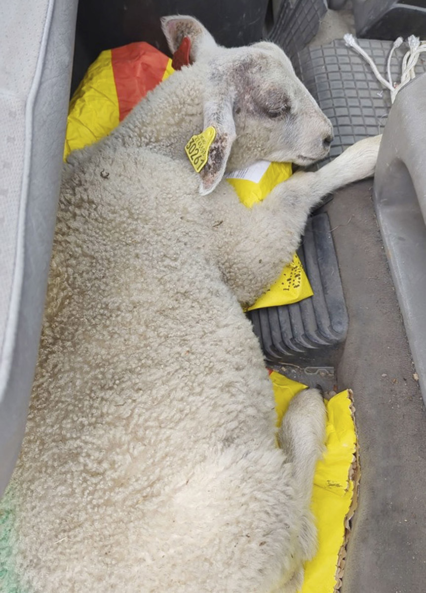 Funne i tide: Lammet funne sjukt på beite. Dette vert frakta heim for behandling.