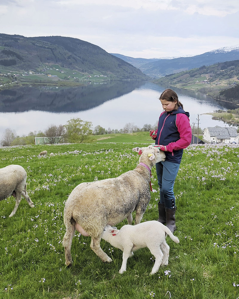 Slik det skal vere: Sunniva, dotter til Liv og Erik har god kontakt med sauene.
