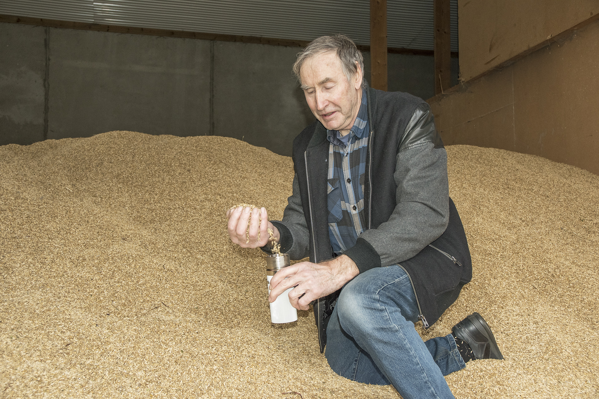Bygg: Per Voll sjekkar fuktigheita i kornet som blir lagra på garden gjennom vinteren. Garden har eiga tørke og produserer stamsæd av byggsorten Heder for Felleskjøpet.