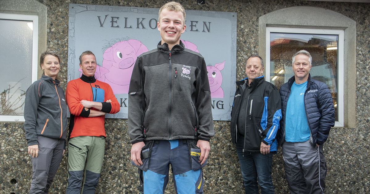 Ryggdekning: Thomas Hadland tar eitt steg fram og overtek ansvaret for navet i Brekkå Purkering. I ryggen har han frå venstre: Nortura-rådgivar Laura Lundgaard Jensen, far, Tommy Hadland, bondekollega og Nortura-tillitsvalt, Willy Finnbakk, og Nortura-rådgivar Eirik Håvarstein.