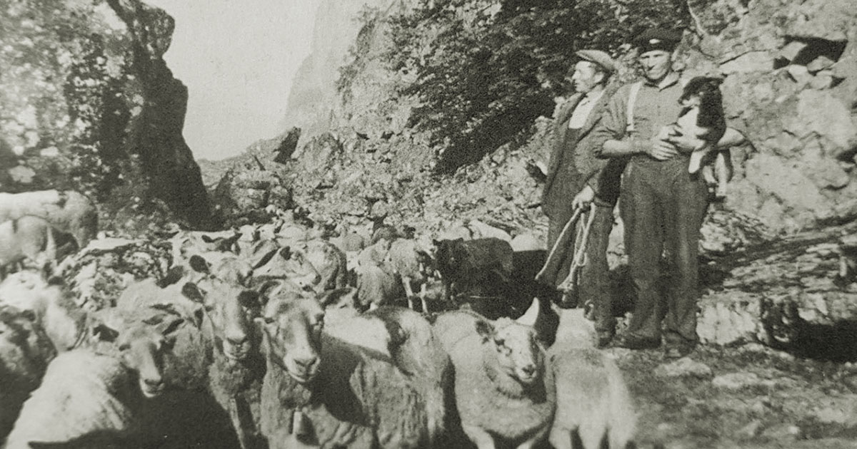 Til fjells: Sauer og gjeterar frå Tysvær Beitelag gjennom Hylsskaret i Suldal på veg til fjells. Ukjent årstal. Foto: Per Magne Førre/Tysvær Bygdeblad.