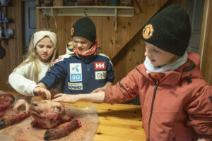 Sjølvberging: Hjå Geir Oluf, fekk elevane høyre om slakting på gamalt vis, om korleis dei brukte dei tok vare på både kjøt og blod. Og dei fekk kjenne på grisehjarte, lever og nyre.