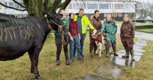 Nytt fjøs-feiring: Ikkje før vart satsinga på skulen deira kjent, før elevane på Øksnavad mønstra representantar frå buskapen for å syna gleda si. Frå venstre: Emma Oline Mellemstrand (fjosmeister), Linda Renate Johnsen (prosjektleiar for Øksnevadvisjonen), Tor Åge Sylta Risnes (rektor), Linda Lima (lærar) samt Eivor Lode og Mariell Borkamo – båe elevar. Foto: Ole Lauvås