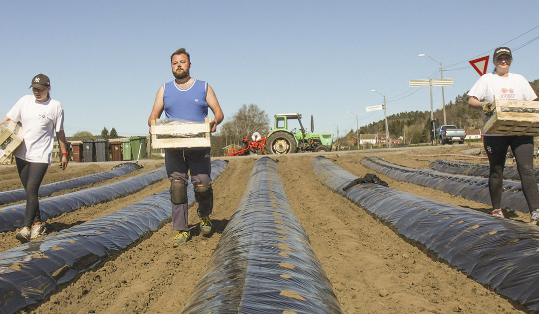 Ti polske sesongarbeidere kom denne uken til Kristiansand for å plante 150.000 jordbærplanter på gården til Karl Yngve Kristensen. – Nå tror jeg dette skal gå bra likevel, tross korona, sier bonden.