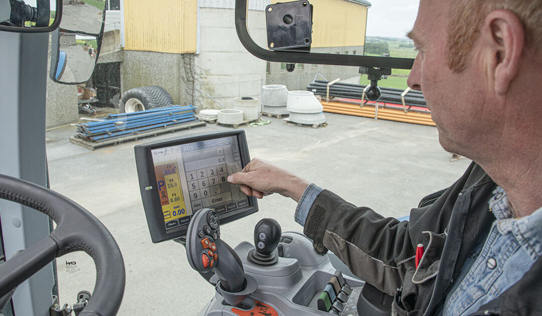 Entreprenør Nils Oma har ettermontert eit automatisk luftreguleringssystem på den nye traktoren. Nå kan han tappe eller fylle luft i dei fire kraftige traktordekka frå den integrerte luftkompressoren med enkle tastetrykk på skjermen.