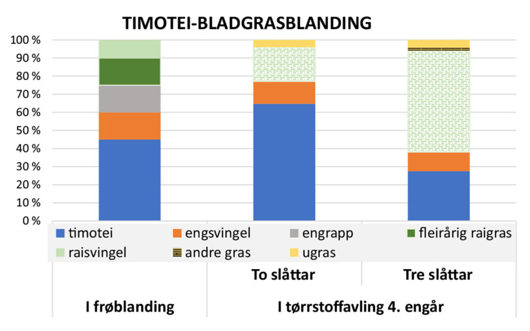 Tenk haustestrategi før du kjøper frøblanding. Er vekstsesongen lang nok til tre slåttar, vil timotei mangla gjenvekstevne til ein tredjeslått. Dette gapet må tettast av artar med god gjenvekstevne. I område med kortare vekstsesong klarar timotei seg betre åleine.