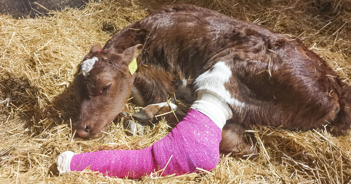 Av og til går ikke kalvingen helt som planlagt, og plutselig er det ei ku som tråkker på kalven sin. Den vanligste skaden på kalver som er tråkket på, er brudd nede i foten. Heldigvis er det også der det er størst sannsynlighet for at det kan fikses.