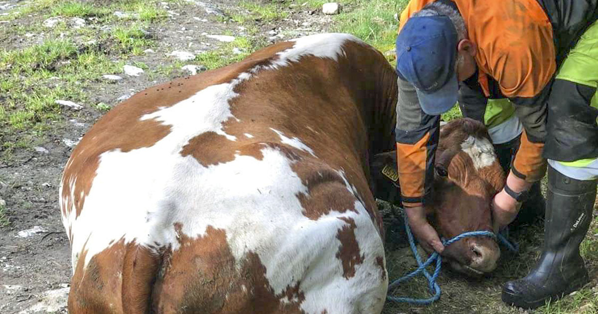 Når føtene ikkje vil bera: Kyr med mjølkefeber behandla ute på beite. Foto: Bjørn Helge Brunborg