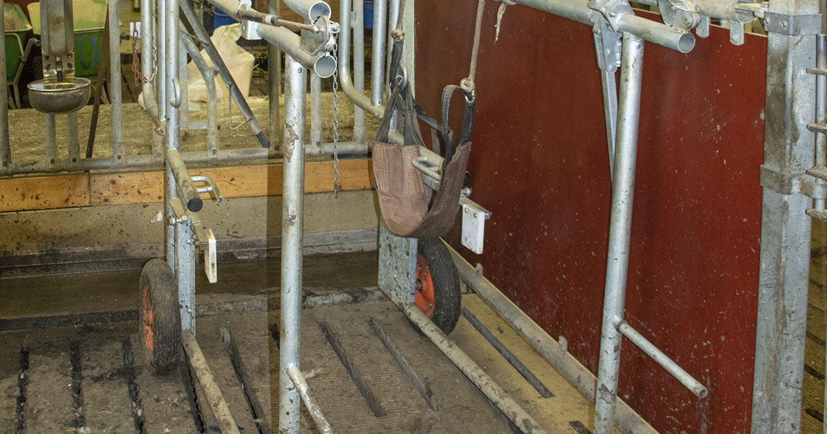 Behandlingsboks: Ved sal av livdyr må veterinæren fylle ut ein helseattest. Eit av spørsmåla på attesten er om klauvspalta er fri for sår, for eventuelt kunne stille diagnosane digital eller interdigital dermatitt. Det spørsmålet kan me ikkje svara på utan at dyret vert undersøkt i ein klauvboks eller behandlingsboks. Foto: Liv Kristin Sola.