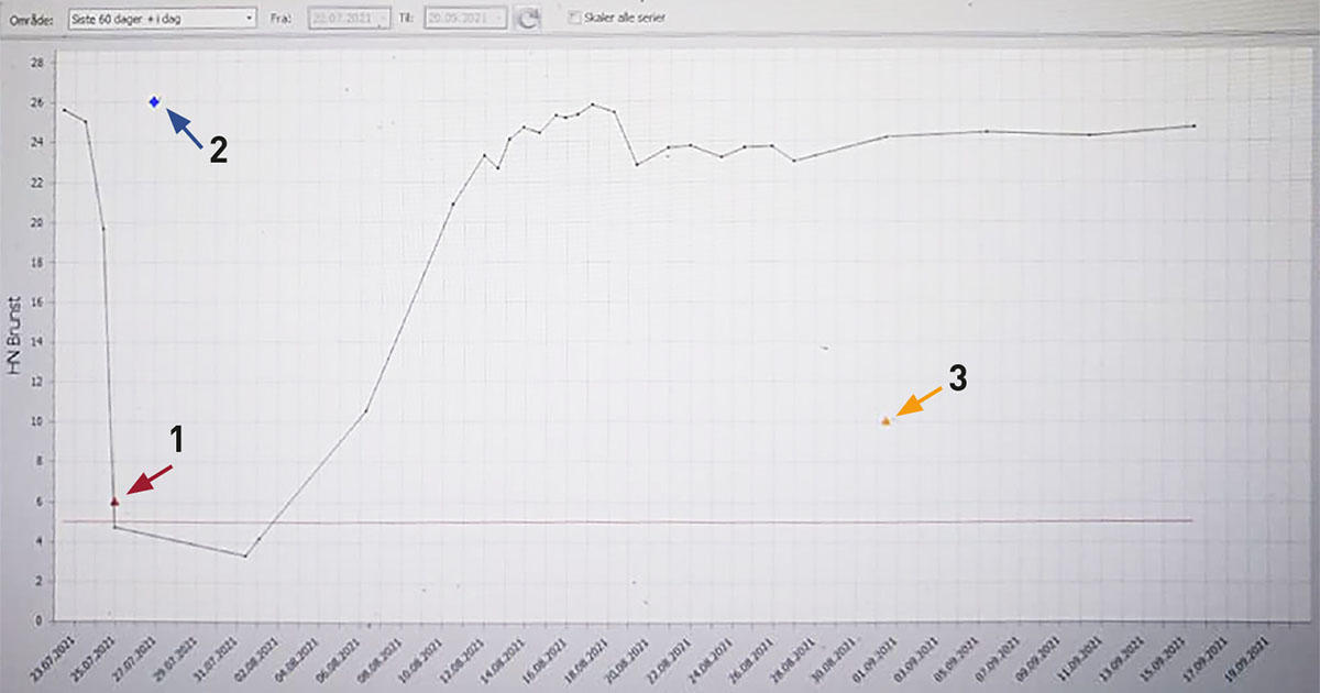 Hjelpemiddel: VMS Repromodul måler progesteronnivået i mjølka til kyrne som skal inseminerast. Den raude prikken (pil 1) indikerer brunst, den blå (pil 2) viser faktisk inseminering og den oransje (pil 3) indikerer at kua er drektig. Kua litt på eit konstant høgt nivå. Foto: Liv Kristin Sola