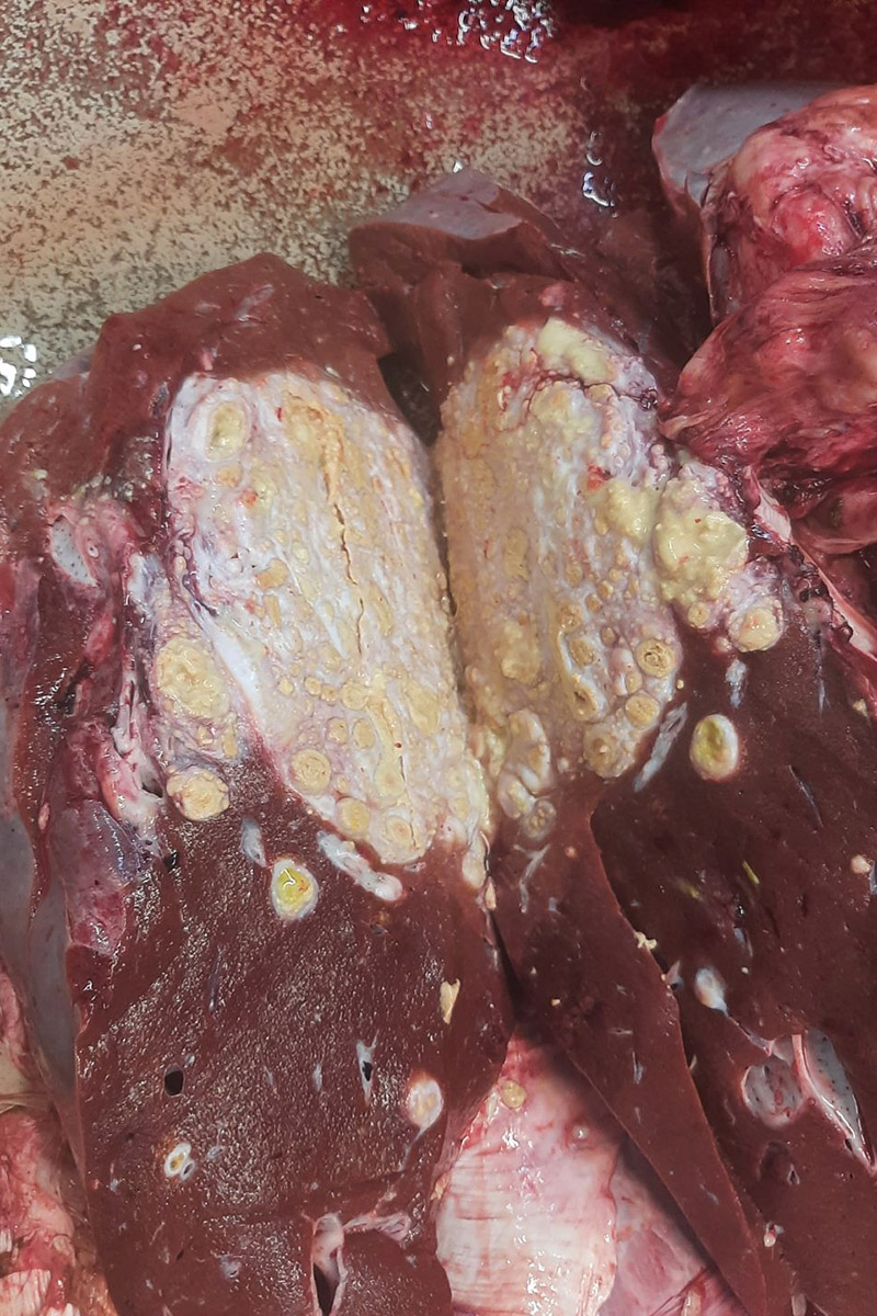 Stor tuberkel i lever: Biletet er tatt i kjøtkontrollen av kua som vart slakta 3. november 2022 (primærkasuset). Mistanke vart fatta i kjøtkontrollen på slakteri på bakgrunn av omfattande tuberkel i fleire organ. Mattilsynet tok ut prøvar som vart sende til Veterinærinstituttet for vidare undersøkingar. Foto er brukt med løyve frå Mattilsynet og stod på trykk i Norsk Veterinærtidsskrift nr 4, 2024.