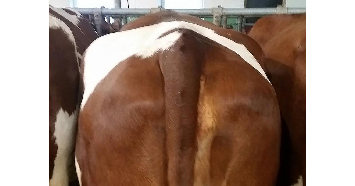 Mål for hold ved kalving: På slutten av laktasjonen har kyrne lett for å leggja på seg og bli i litt for godt hold. Denne kua har om lag 4 i holdpoeng. Mange kan setja seg mål om at holdet bør liggja stabilt mellom 3 og 3,5 ved kalving og ved avsining. Kyrne skal vera litt «kantete».
